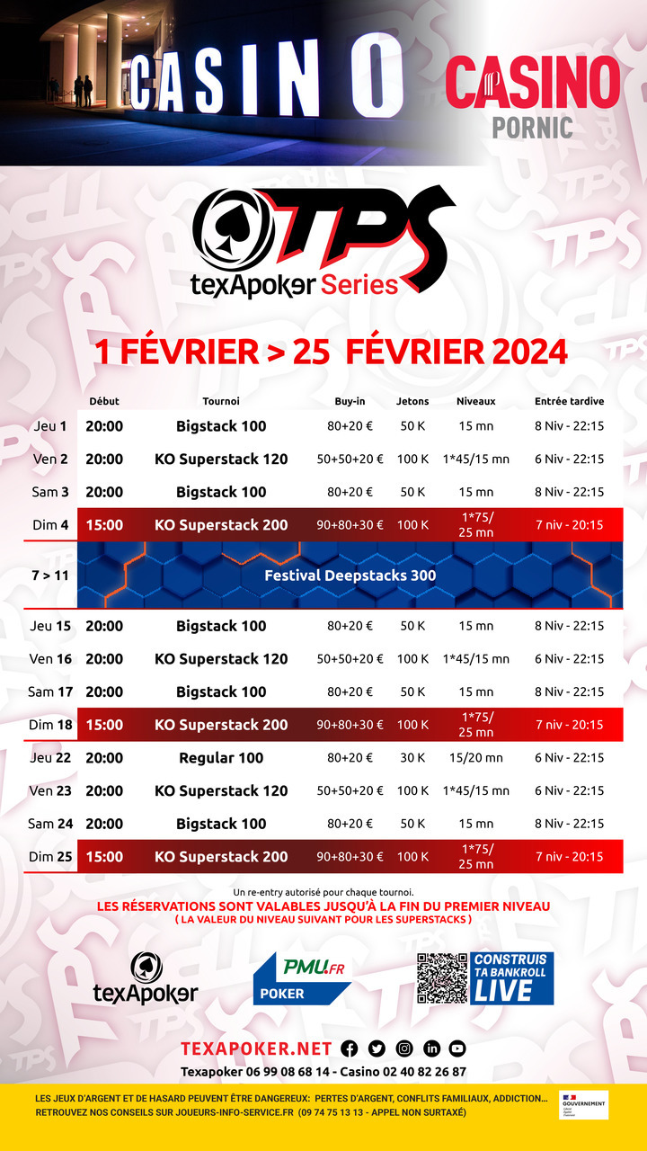 Le TPS est la marque de fabrique de Texapoker ! En partenariat avec PMU.fr, les tickets remportés sur PMU.fr sont utilisables sur l'ensemble des tournois.