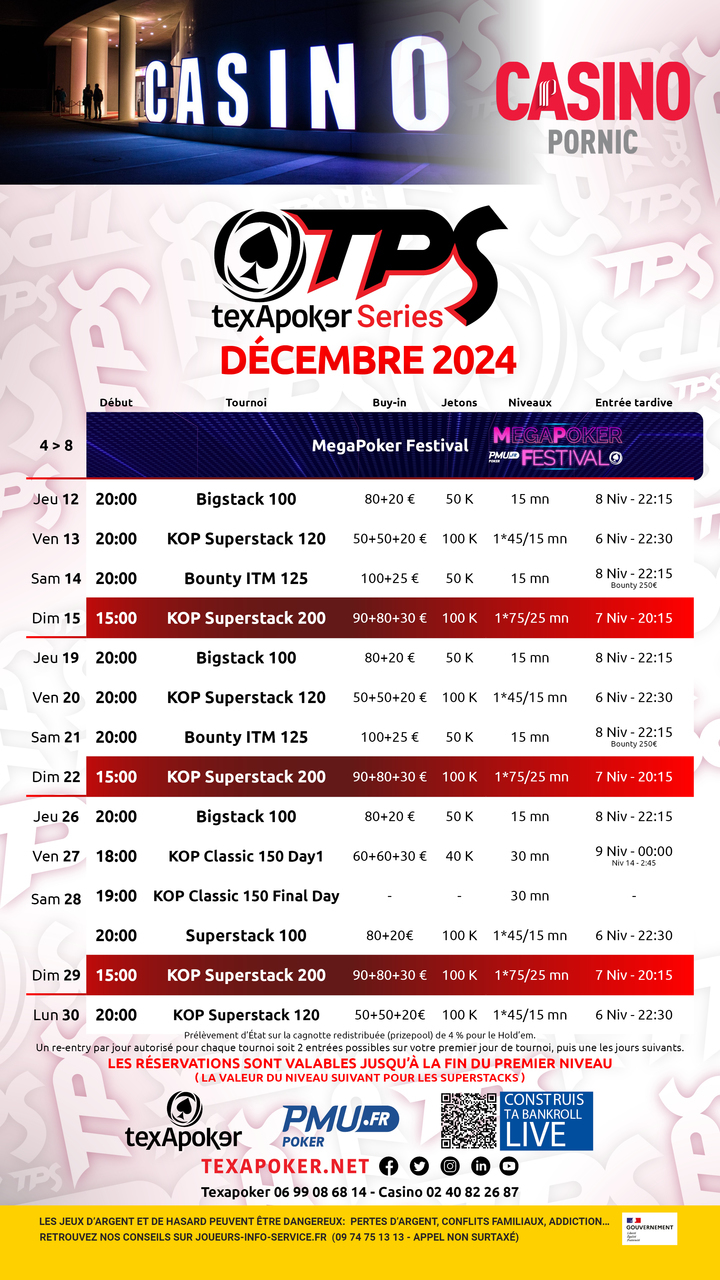 Le TPS est la marque de fabrique de Texapoker ! Comme sur tous les tournois TPS, les tickets remportés sur PMU.fr sont utilisables sur l'ensemble des tournois.