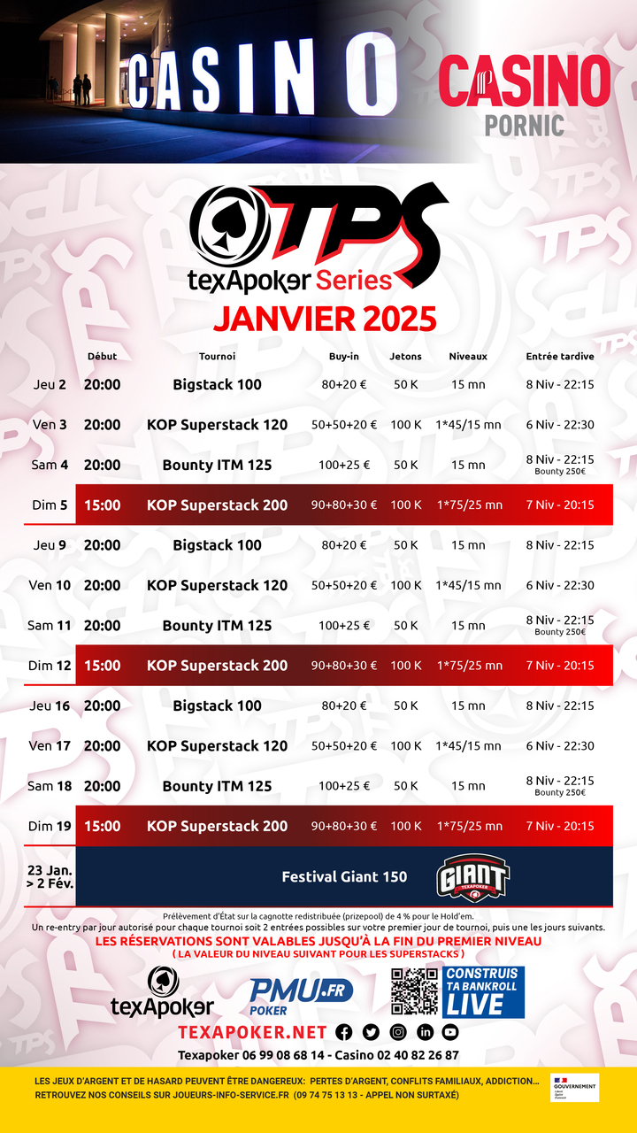 Le TPS est la marque de fabrique de Texapoker ! Comme sur tous les tournois TPS, les tickets remportés sur PMU.fr sont utilisables sur l'ensemble des tournois.
