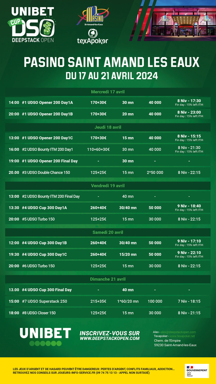 Les UDSO Cup sont de retour pour 2024, et toujours en partenariat avec Texapoker ! La prochaine édition de ce circuit se déroulera au Pasino de Saint-Amand !