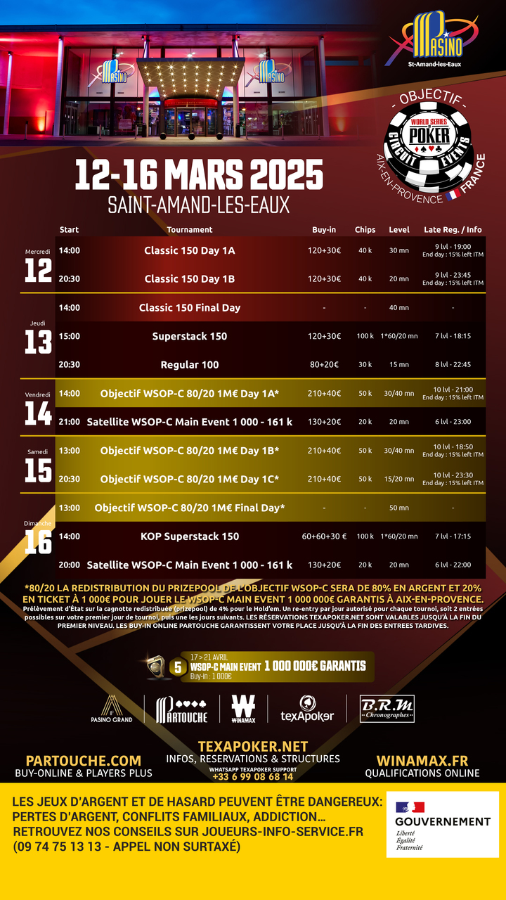 Retrouvez ainsi en Main Event un Objectif WSOP-C 80/20 avec ses 3 jours de démarrage, avec un stack de départ de 50k et des niveaux de 30/40 puis 50 minutes au Day2 ! 80% du prizepool sera redistribué en cash tandis que les 20% restant seront convertis en ticket à 1 000€ pour jouer le WSOP-C Main Event 1M€ GTS à Aix-en-Provence. En ouverture de festival vous pourrez retrouver du mercredi au jeudi un Classic 150, un Superstack 150, ainsi qu'un Super Sunday 150 en clôture du festival ! Deux satellites pour  se qualifier au WSOP-C Main Event 1M€ GTS à 1 000€ seront également mis en place.