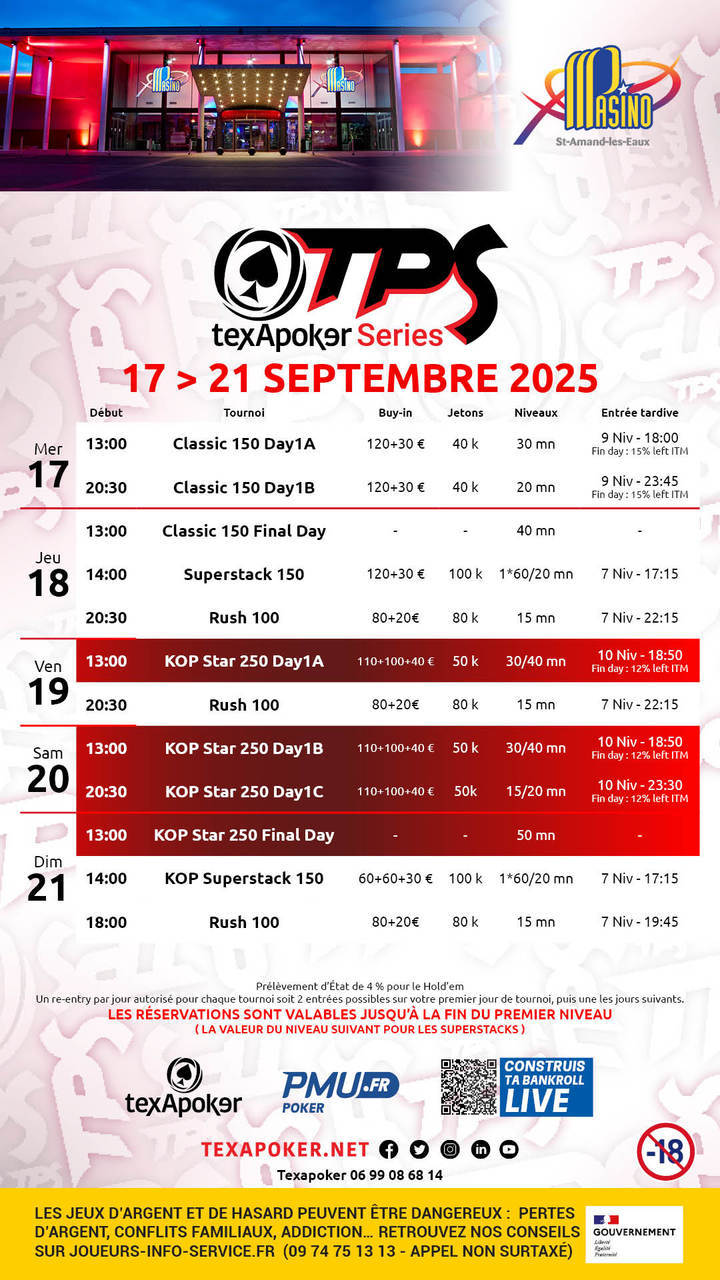 Le TPS est la marque de fabrique de Texapoker ! Comme sur tous les tournois TPS, les tickets remportés sur PMU.fr sont utilisables sur l'ensemble des tournois.