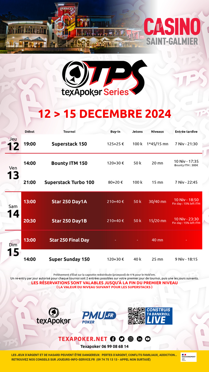 De retour au casino de Saint-Galmier, retrouvez le Star 250, tournois phare de Texapoker, ainsi qu'un Superstack 150, un Bounty ITM 150 et un une nouveauté avec le Super Sunday 150 !