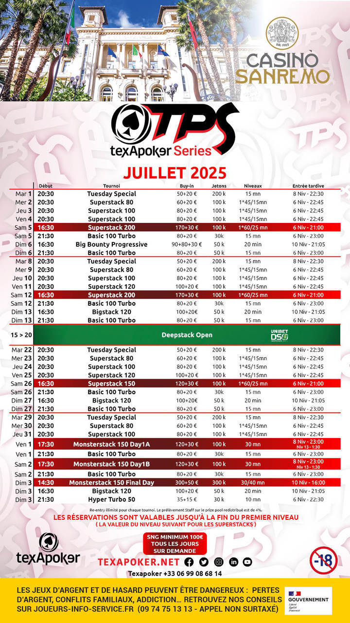 Retrouvez les tournois hebdomadaires avec des Superstack 80 , 100, 120 et 200 ainsi qu'un Bigstack 120