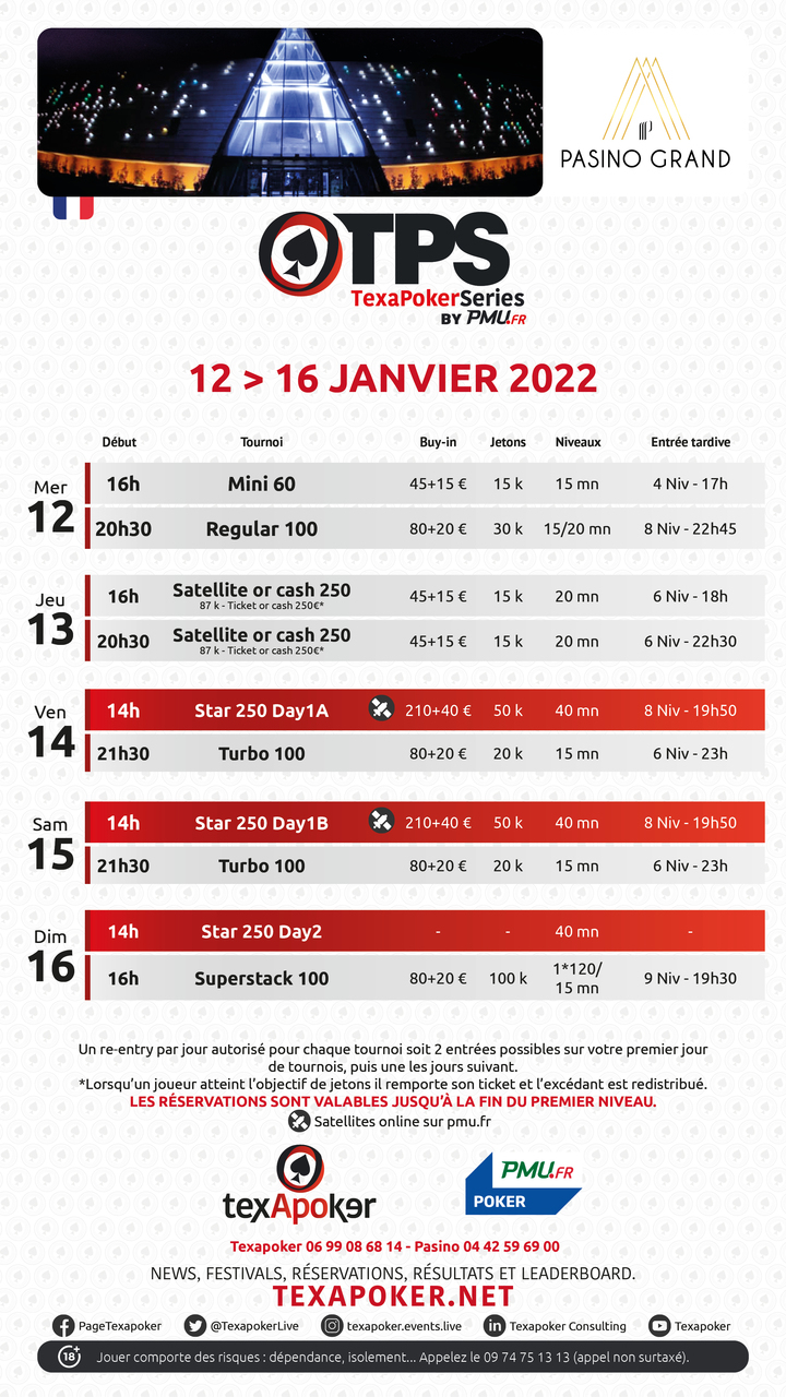TPS è il marchio di Texapoker! In collaborazione con PMU.fr, puoi provare a vincere il tuo posto ai tornei live di Texapoker su uno dei loro satelliti online.