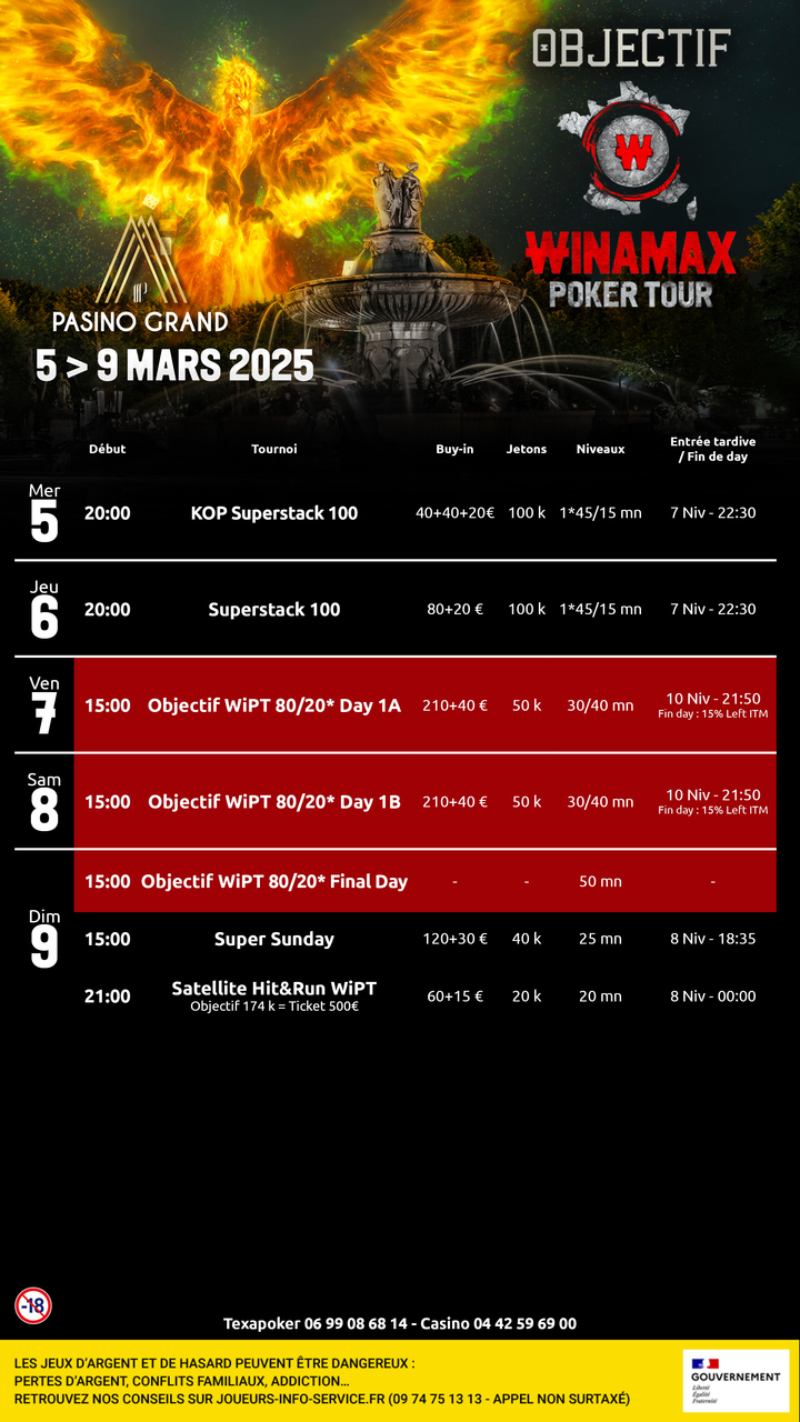 Nel Main Event, troverete il WiPT Objective da 250 euro, con uno stack iniziale di 50.000 fiches e livelli di 30 e 40 minuti. Per questo torneo, il 20% del montepremi sarà convertito in un biglietto da 500 euro per la finale del WiPT di Aix-en-Provence! Inoltre, si terranno diversi tornei collaterali, come il KO Superstack 100, il Superstack 100, il Super Sunday e i satelliti Hit & Run per qualificarsi alla finale del WiPT!