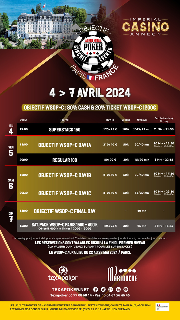 Nel Main Event, troverete il WSOP-C Objective da 250 euro, con uno stack iniziale di 50.000 fiches e livelli di 30 e 40 minuti. Per questo torneo, il 20% del montepremi sarà convertito in un biglietto da 1.200 euro per il Main Event WSOP-C di Parigi! Inoltre, sono previsti diversi tornei collaterali, come il Superstack 150 e il Regular 100.