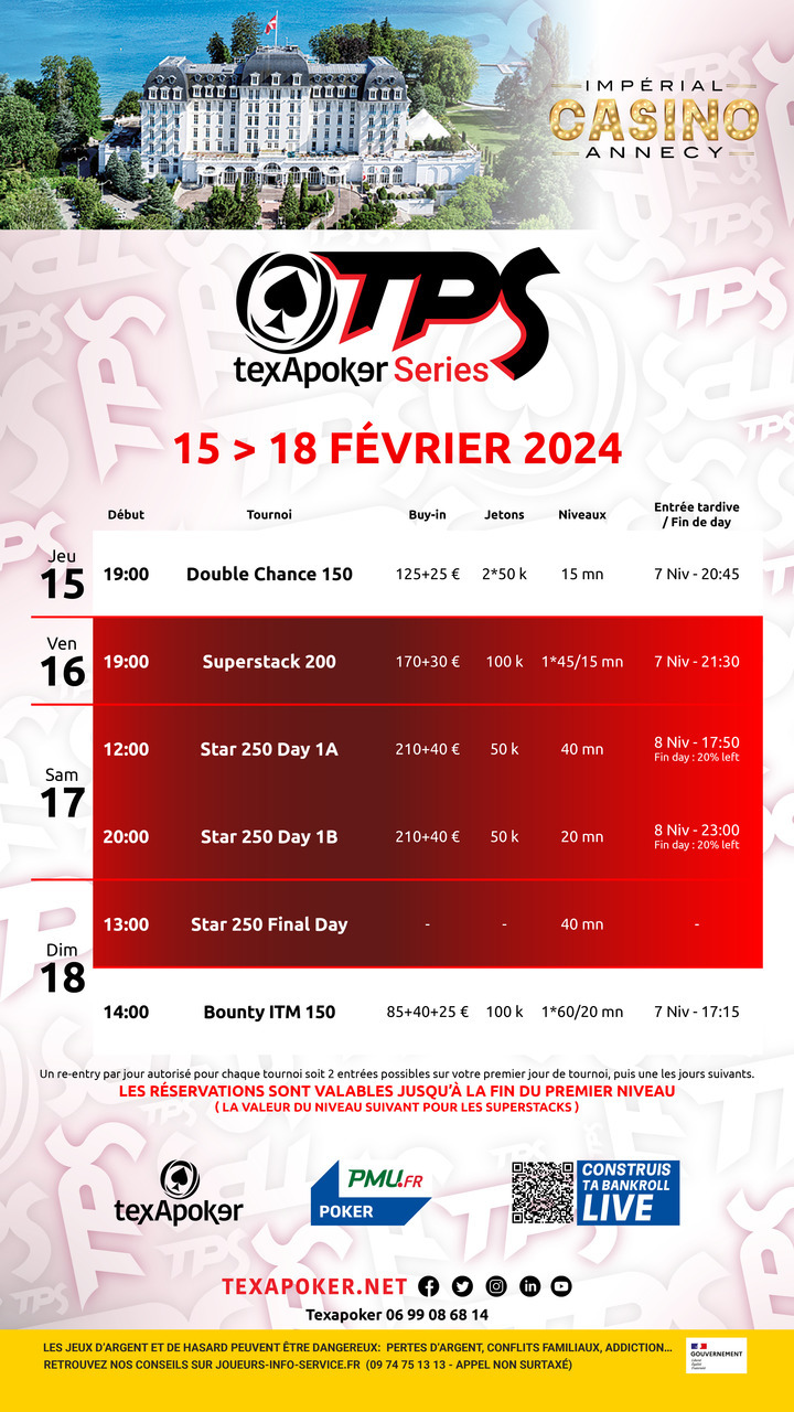 TPS è il marchio di Texapoker e arriva ad Annecy! In collaborazione con PMU.fr, i biglietti vinti su PMU.fr possono essere utilizzati in tutti i nostri tornei.