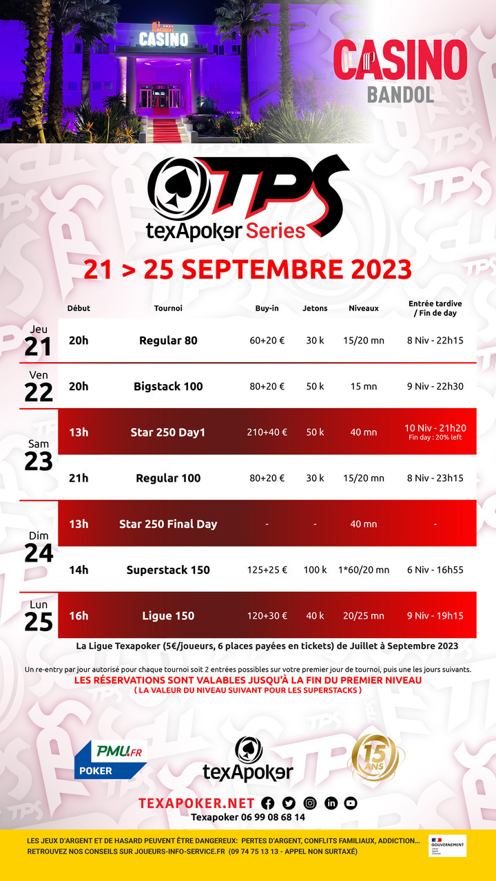 Infine, al casinò di Bandol, troverai lo Star 250, il torneo di punta di Texapoker, oltre ai tornei regolari del lunedì !
