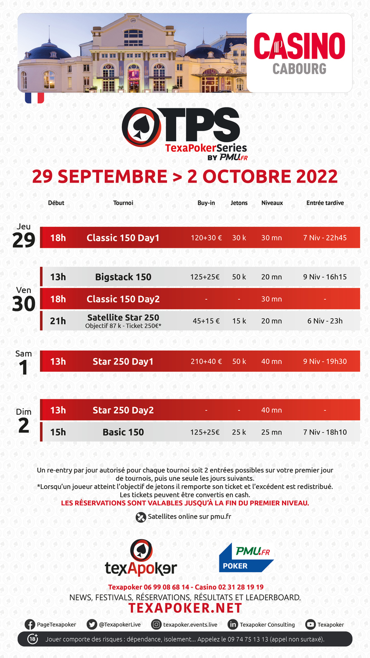 Texapoker arriva a Cabourg! Per il suo arrivo in questa nuova destinazione, potrete trovare lo Star 250, il torneo di punta di Texapoker, così come un Classic 150 di apertura, e un Basic 150!