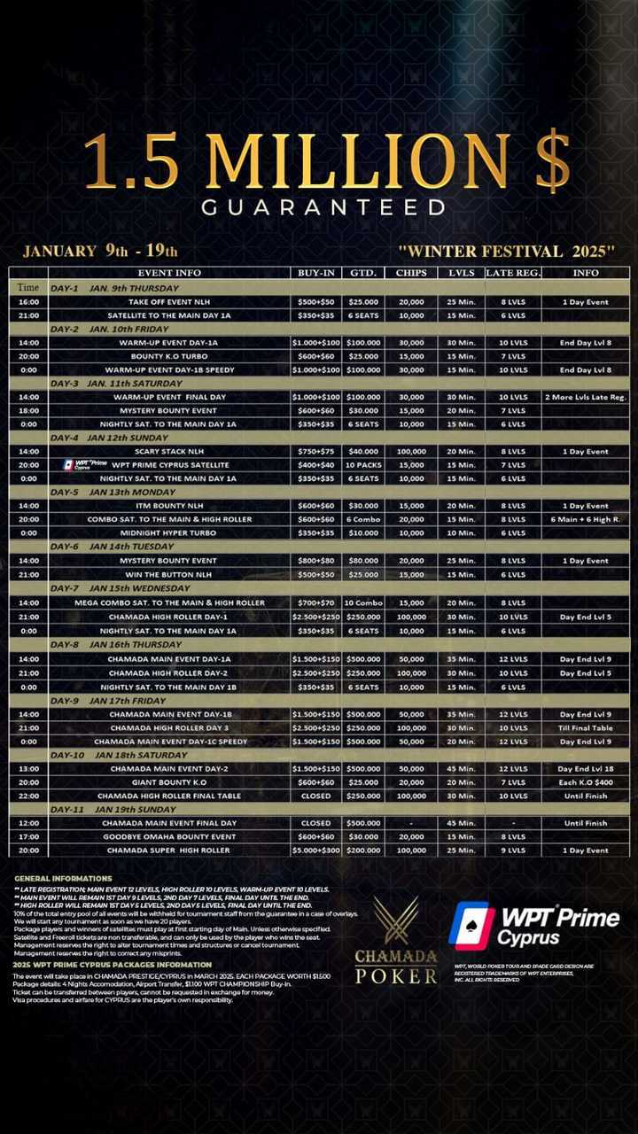Siamo lieti di annunciare la nostra nuova partnership con il prestigioso Casinò Chamada. Questa partnership porta al Chamada Winter Festival con 1.500.000 dollari garantiti nel corso dell'intero festival, un evento di poker come nessun altro, che si svolgerà dal 9 al 19 gennaio 2025.