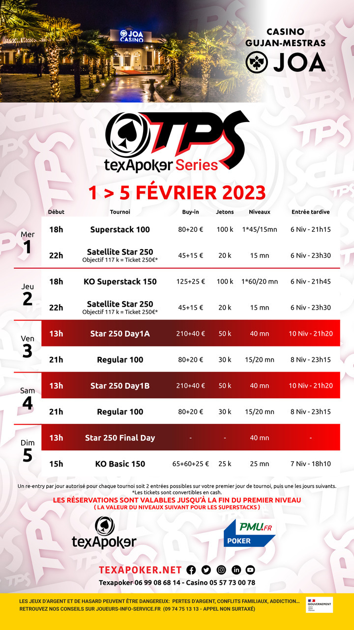 TPS è il marchio di Texapoker! In collaborazione con PMU.fr, puoi provare a vincere il tuo posto nei tornei live di Texapoker su uno dei loro satelliti online.