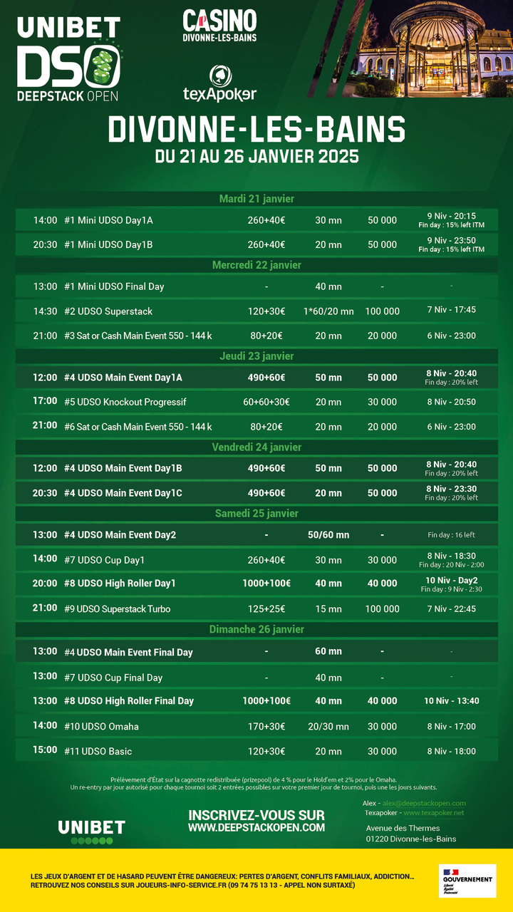 Il Main Event da 550 euro prevede uno stack iniziale di 50.000 fiches e livelli da 50/60 minuti! Sarà accompagnato da numerosi satelliti che vi permetteranno di vincere il vostro posto, oltre a vari tornei collaterali come il Mini UDSO e l'UDSO Cup da 300€, i Turbo Superstack da 150€, un Progressive KO da 150€ e, per concludere il festival, un Omaha e un Basic!