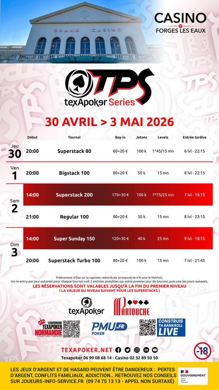 Questa settimana al Pasino de Forges-les-Eaux, partecipa a un Superstack 80, un Bigstack 100, un Superstack 200, un Super Sunday 150, oltre a un Regular 100.