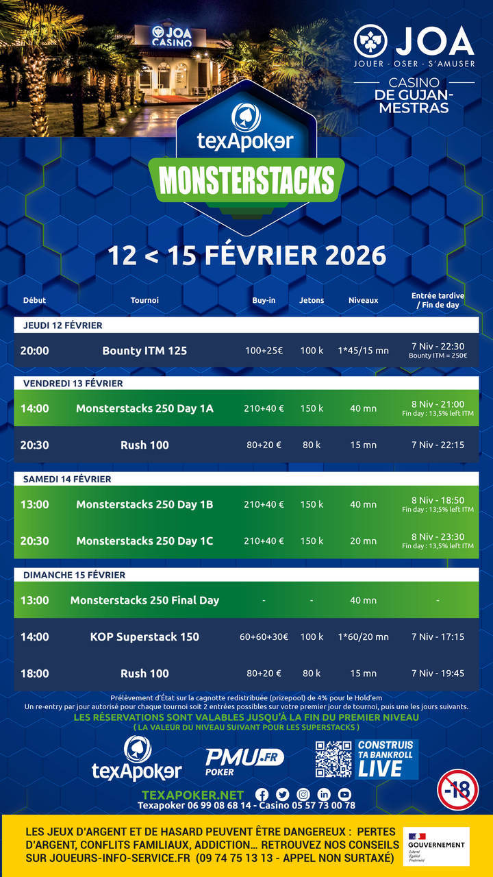 Texapoker torna al Casino JOA de Gujan-Mestras con il Texapoker Monsterstacks! I biglietti vinti su PMU.fr possono essere utilizzati in tutti i tornei.