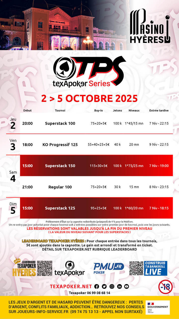 TPS è il marchio di Texapoker! Come per tutti i tornei TPS, i biglietti vinti su PMU.fr possono essere utilizzati per tutti i tornei.