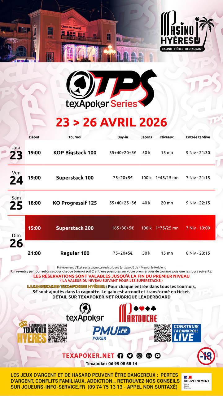 TPS è il marchio di Texapoker! Come per tutti i tornei TPS, i biglietti vinti su PMU.fr possono essere utilizzati per tutti i tornei.