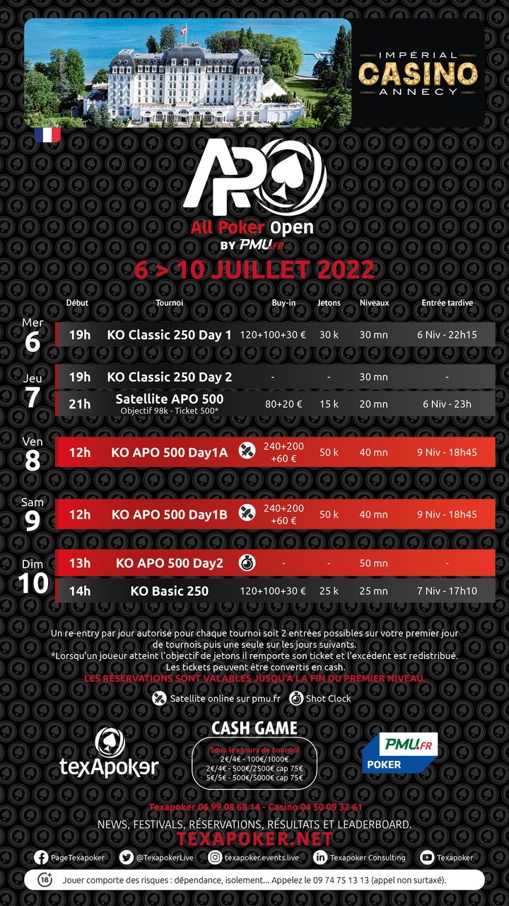 Al Casinò Impérial di Annecy, Texapoker ti propone l'APO 500 KO Progressive, che durerà da venerdì a domenica! Oltre a un evento principale, puoi trovare un KO Classic 250 per aprire il festival, e un KO Basic 250 per chiuderlo.