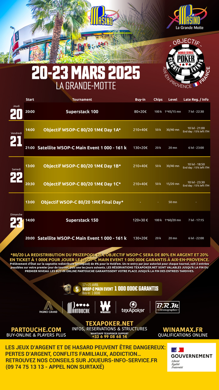 Nel Main Event, troverete un obiettivo WSOP-C 80/20 con un inizio di 3 giorni, uno stack iniziale di 50k e livelli di 30/40 e 50 minuti nel Day2! L'80% del montepremi sarà versato in contanti, mentre il restante 20% sarà convertito in un biglietto da 1.000 euro per partecipare al Main Event WSOP-C €1M GTS di Aix-en-Provence. Il festival si aprirà con un Superstack 100 il giovedì, oltre a un Superstack 150 per chiudere il festival! Ci saranno anche due satelliti per qualificarsi al Main Event WSOP-C €1M GTS da €1.000.