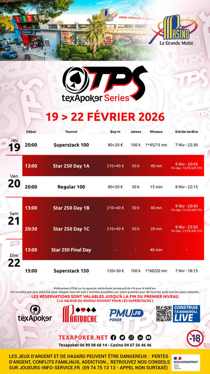 Il TPS è il marchio di fabbrica di Texapoker! In collaborazione con PMU.fr, i biglietti vinti su PMU.fr sono utilizzabili in tutti i tornei.