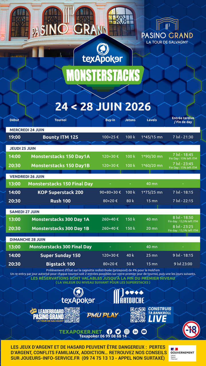 Texapoker torna al Pasino Grand La Tour-de-Salvagny con i Texapoker Monsterstacks! I biglietti vinti su PMU PLAY sono utilizzabili in tutti i tornei.