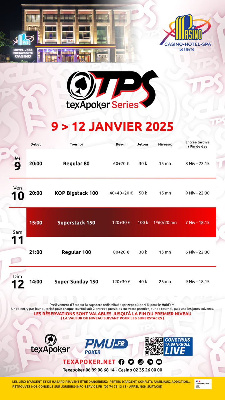 Unisciti a noi al Pasino du Havre per un Regular da €80, un KOP Bigstack da €100, un Superstack da €150, un Regular da €100 e un Superstack da €100.