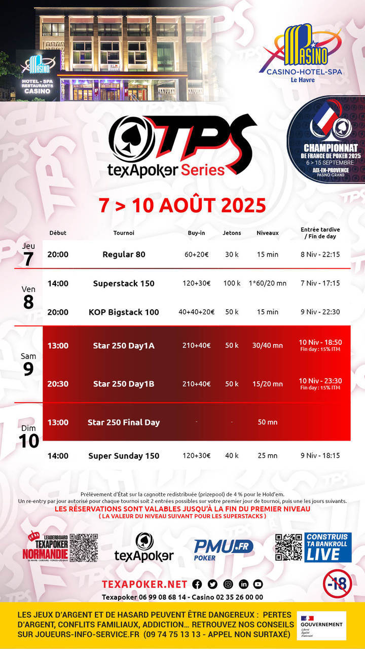 Unisciti a noi al Pasino du Havre per un Main Event Star da €250, accompagnato da vari eventi collaterali come un Superstack da €150, un KOP Bigstack da €100, un Regular da €80 e un Super Sunday da €150.