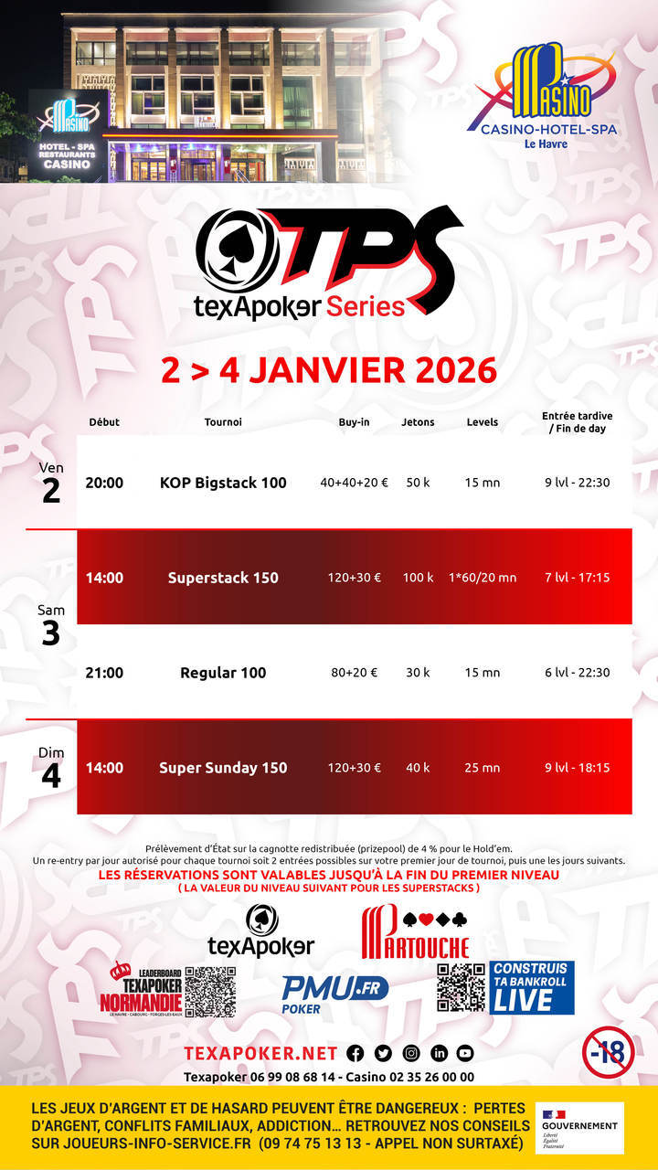Unisciti a noi al Pasino du Havre per un Regular da €80, un KOP Bigstack da €100, un Superstack da €150, un Regular da €100 e un Superstack da €100.