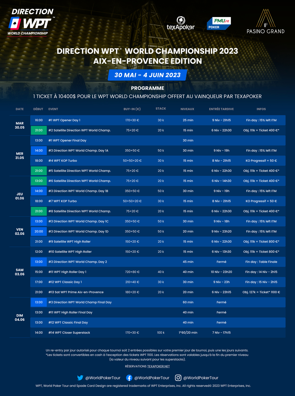 Un Main Event da 400 euro si terrà al Pasino Grand di Aix-En-Provence. Oltre al montepremi complessivo, il vincitore del Main Event riceverà un biglietto da 10.400 dollari per il WPT World Championship al Wynn di Las Vegas nel dicembre 2023.