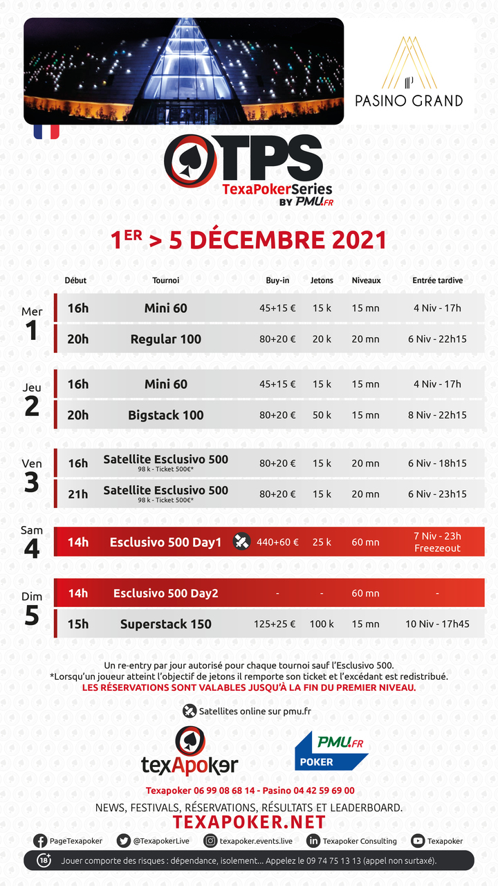 TPS è il marchio di Texapoker! In collaborazione con PMU.fr, puoi provare a vincere il tuo posto nei tornei live di Texapoker su uno dei loro satelliti online.