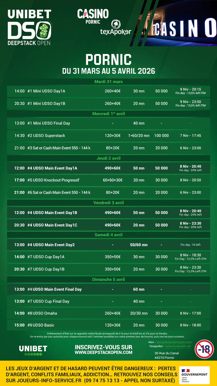 L'Unibet DeepStack Open torna nel 2026, sempre in collaborazione con Texapoker! La prossima tappa di questo circuito si svolgerà al Casinò di Pornic!