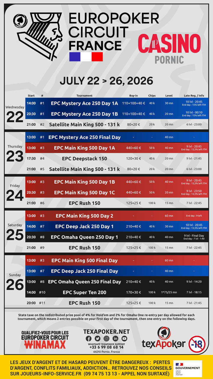 Dal 22 al 26 luglio, l'EuroPoker Circuit France proporrà un festival articolato attorno a 5 tornei “Ace, King, Queen, Jack, Ten” con diversi diritti di ingresso e formati. Partner dell'EPC, Winamax propone qualificazioni online ogni martedì alle 21:15 con un Satellite da 50 € per 500 € di Bankroll Live.