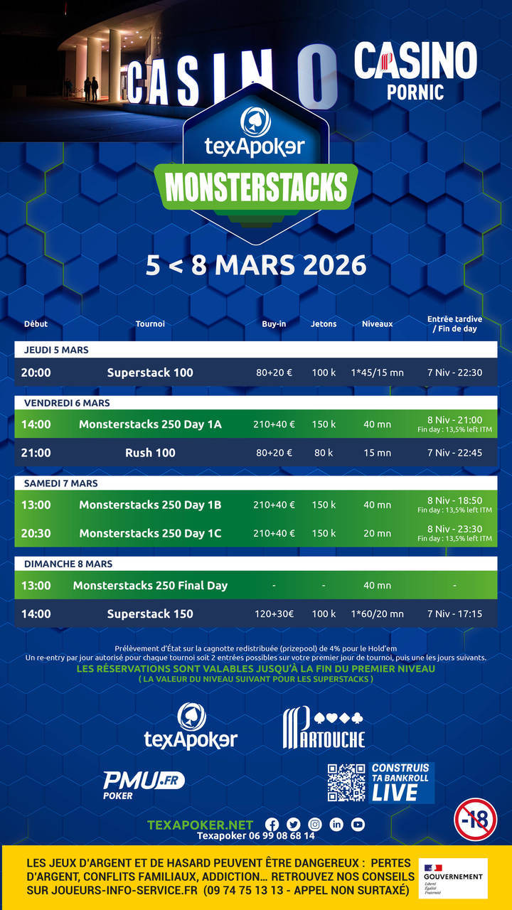 Texapoker torna al Casino de Pornic con il Texapoker Monsterstacks! I biglietti vinti su PMU.fr possono essere utilizzati in tutti i tornei.