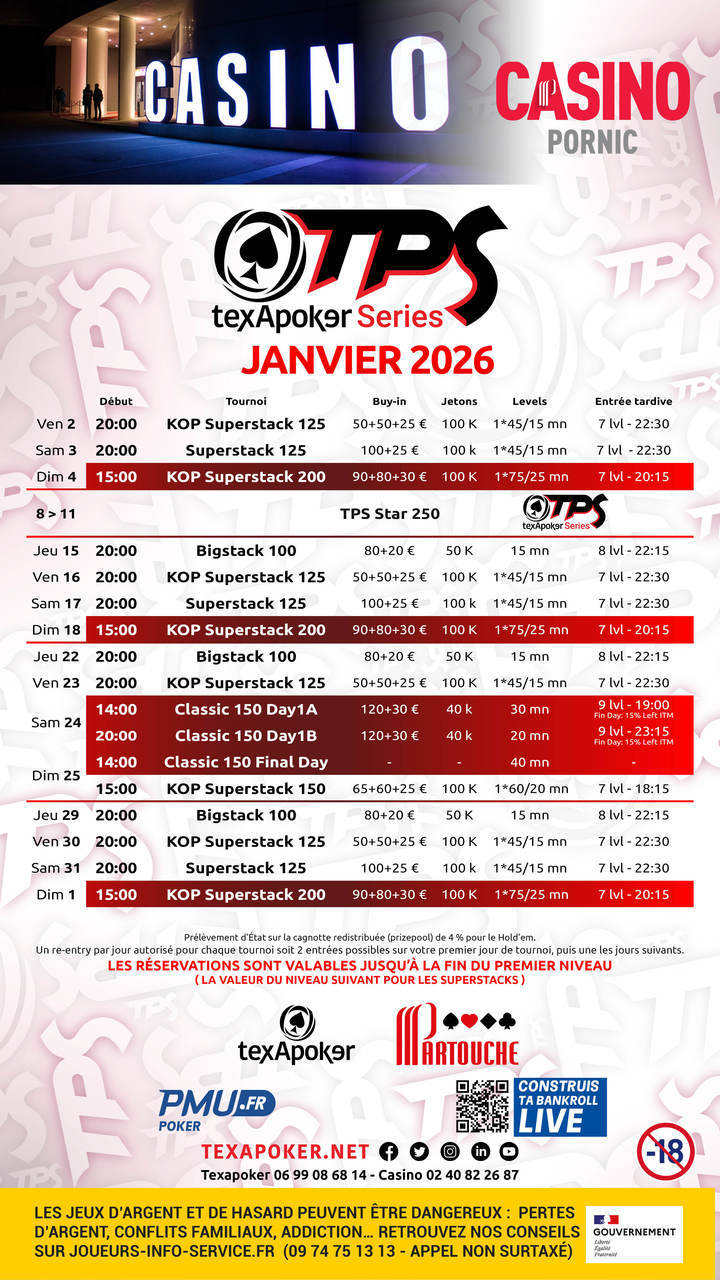 Scopri i tornei settimanali al Casinò di Pornic! Troverai una varietà di eventi, tra cui Bigstack da 100€, e Classic 150€, e KO Superstack da 125€ e 200€!