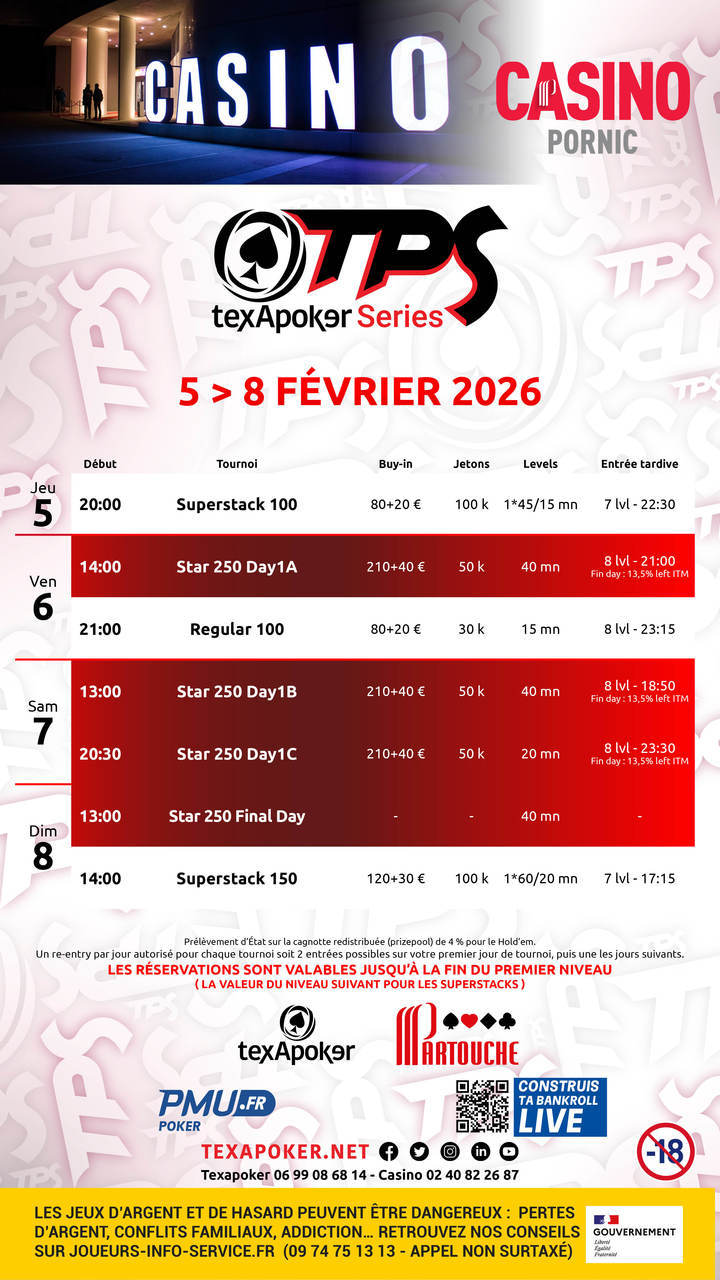 Il TPS è il marchio di fabbrica di Texapoker! Come in tutti i tornei TPS, i biglietti vinti su PMU.fr possono essere utilizzati per qualsiasi torneo.