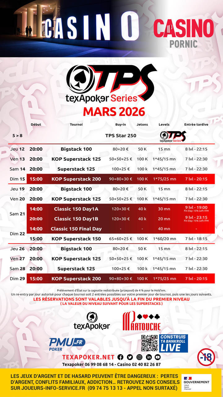 Il TPS è il marchio di fabbrica di Texapoker! Come in tutti i tornei TPS, i biglietti vinti su PMU.fr possono essere utilizzati per qualsiasi torneo.