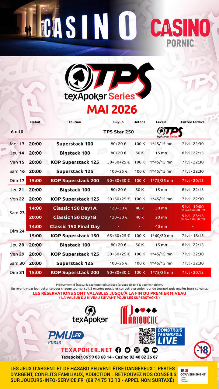 Scopri i tornei settimanali al Casinò di Pornic! Troverai una varietà di eventi, tra cui Bigstack da 100€, e Classic 150€, e KO Superstack da 125€ e 200€!