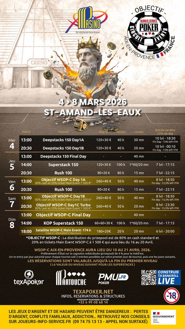 Nel Main Event troverete un obiettivo WSOP-C 80/20 con 2 giorni di avvio, uno stack iniziale di 50k e livelli di poi di 40 minuti! L'80% del montepremi sarà ridistribuito in contanti, mentre il restante 20% sarà convertito in un ticket da 1.500 € per giocare il WSOP-C Main Event ad Aix-en-Provence. In apertura, potrete trovare un Deepstacks da 150 € su due giorni e, in allegato, vari tornei come il Superstack da 150 €, il KOP Superstack da 150 € e il Rush da 100 €!