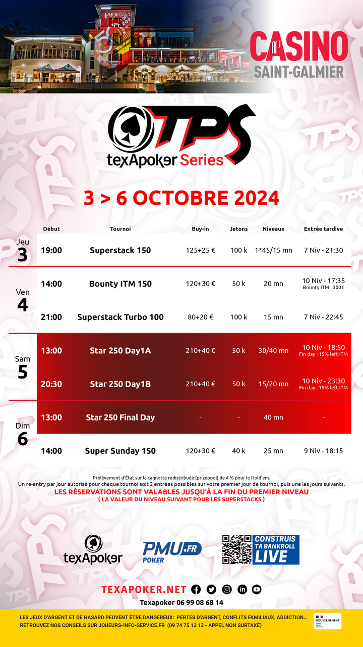 Di ritorno al Casino di Saint-Galmier, troverete lo Star 250, il torneo di punta di Texapoker, insieme a un Superstack 150, un Bounty ITM 150 e una novità con il Super Sunday 150!