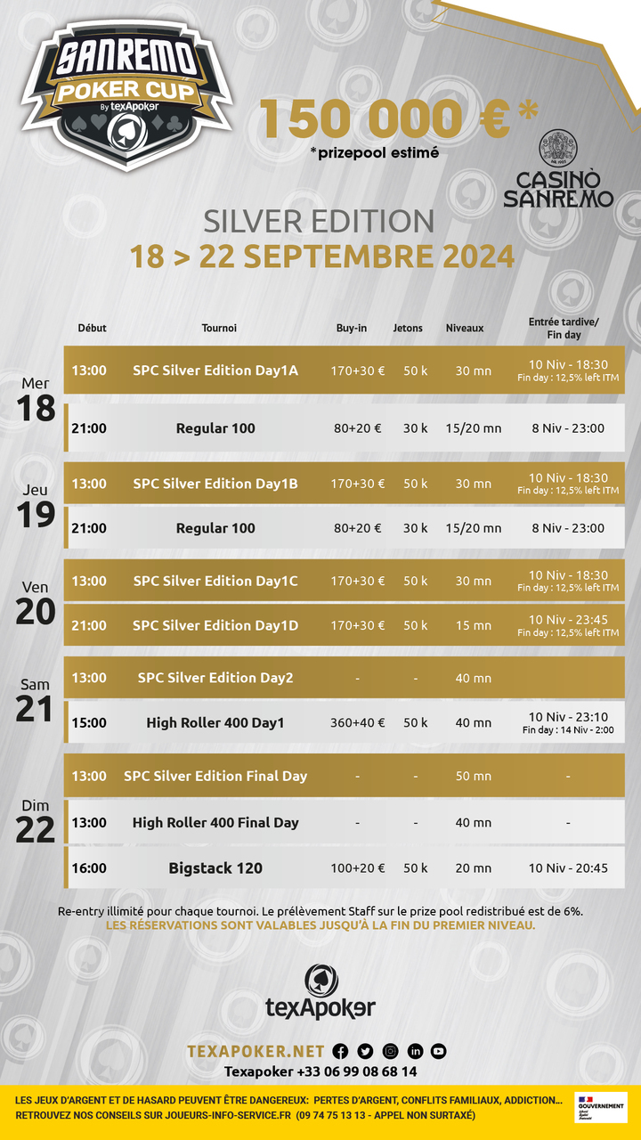 Il Main Event di questa settimana prevede la Sanremo Poker Cup da 200€, con 4 Day 1, uno stack iniziale di 50.000 chips e livelli di 30, 40 e 50! Ci saranno anche diversi tornei collaterali, tra cui un Regular 100, un High Roller 400 e un Bigstack 120.